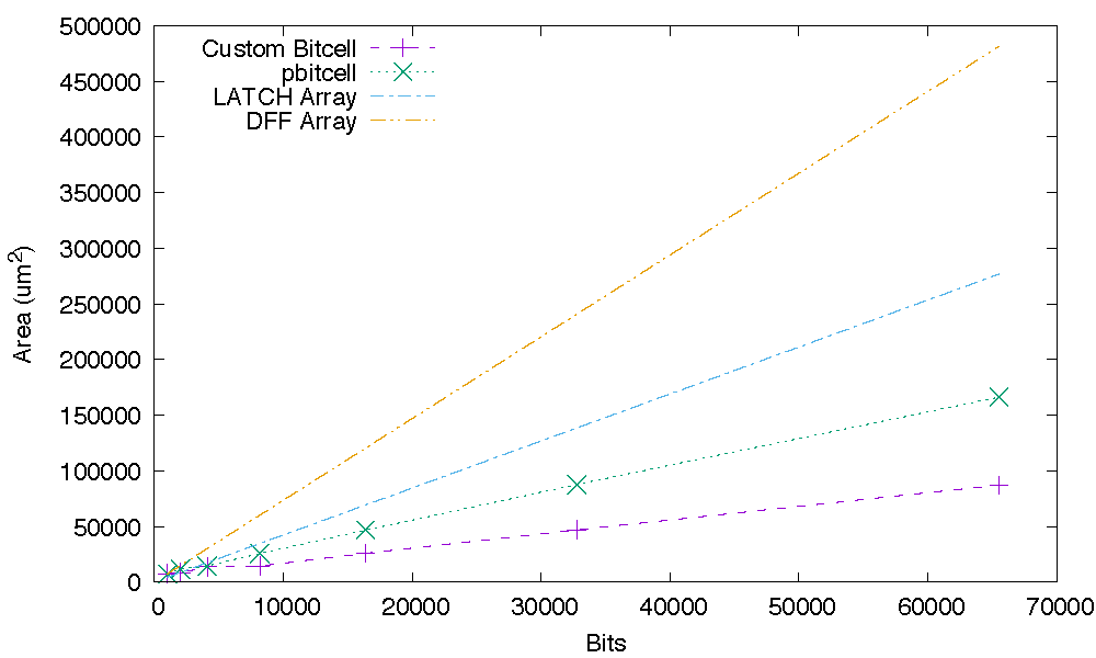 | Standard 6T (1rw) 6.8um x 9.2um | Isolated Read 10T (1rw, 1r) 10.9um x 13.9um | DFF 21.9um x 21.2um (from OSU standard cell library) |