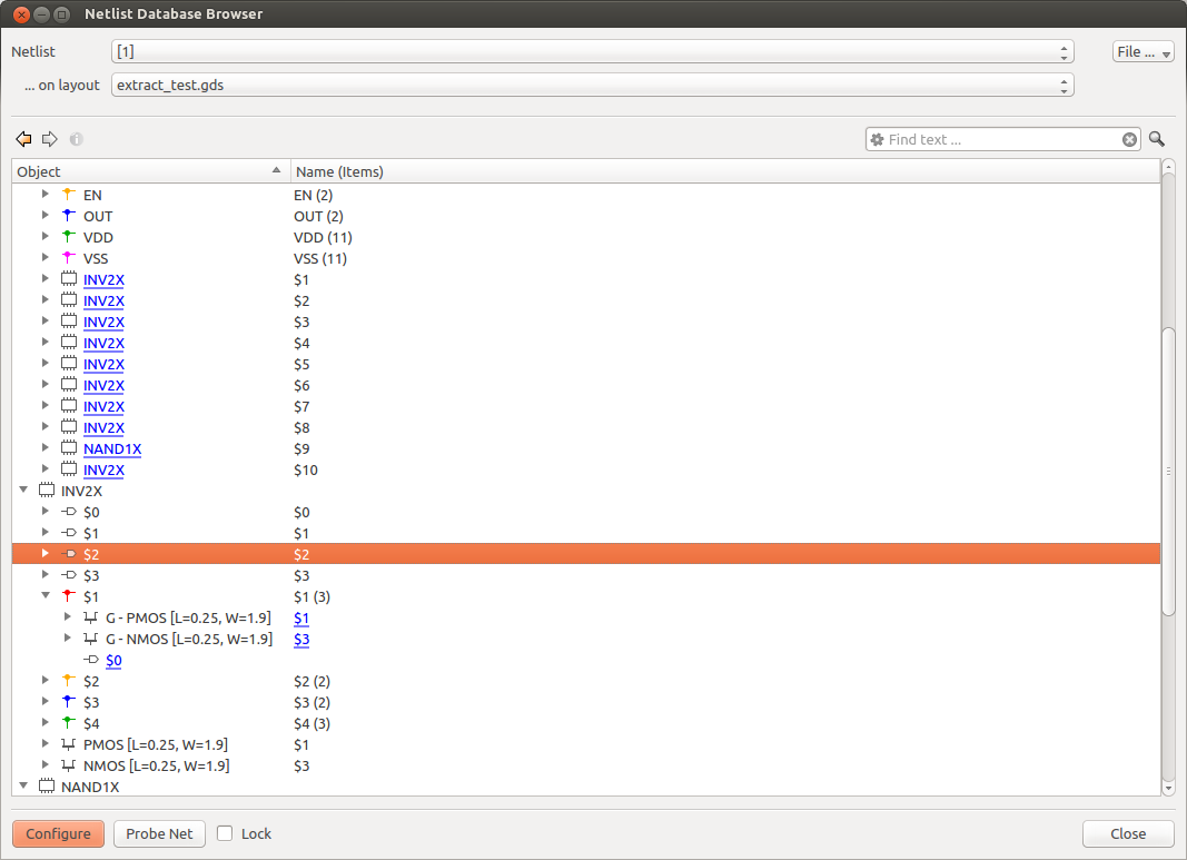 The central element of the browser is the netlist view. It is a hierarchical view of: